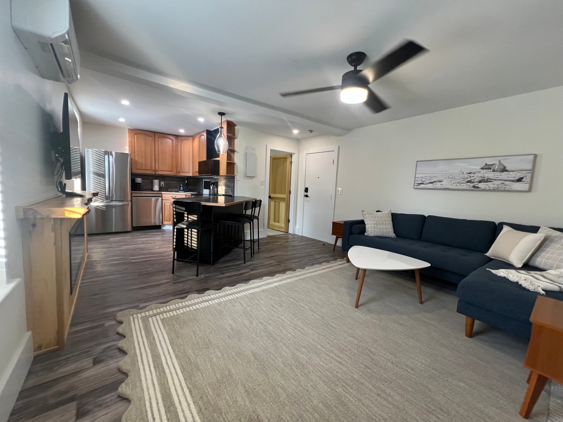 - An open-concept kitchen, living, and dining area perfect for relaxing or entertaining. The space is anchored by a live-edge fireplace mantel, paired with an eco-friendly electric fireplace and an HDTV above. The TV includes LG TV channel options and Netflix for endless entertainment.
